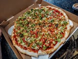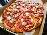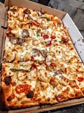 Fresh mozzarella, crumbled sausage, double pepperoni (thinly sliced & Roni cups), shaved pecorino romano, fresh basil.