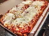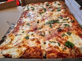 Thick crust square pizza with tomato sauce, mozzarella, and basil.
