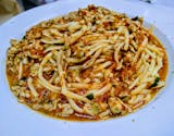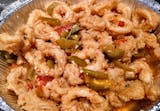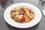 Chicken, sausage, potato, hot and sweet vinegar peppers in white wine sauce.