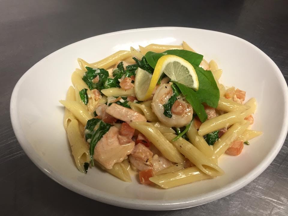 Penne pasta with shrimp, spinach & grape tomato in a pesto cream sauce.