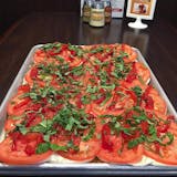 Thin garlic basted pan pizza crust topped with tomatoes, roasted peppers, homemade mozzarella cheese & basil, drizzled with a touch of virgin oil & pesto.