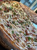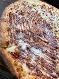 White pie with chicken, bacon and drizzled with Ranch dressing. 18in pie (feeds 3-4)