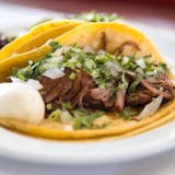 Warm corn tortilla, choice of protein, cilantro, chopped onion, lime, and green sauce on the side.