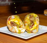 A breakfast wrap consisting of a 12-inch flour tortilla filled with home fries and your choice of bacon, sausage, or chorizo, topped with swiss, american, or cheddar cheese.