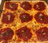 Thin square pan crust topped with old fashioned mozzarella cheese, marinara sauce, fresh garlic, basil, and extra virgin olive oil.
