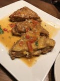 Topped with eggplant and sliced tomato in a brown marsala wine sauce, topped with mozzarella cheese, finished in the oven.