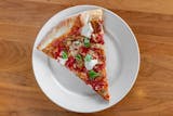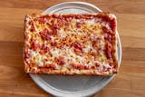 Thin sicilian-type crust brushed with olive oil & pesto sauce, mozzarella, and spotted with chunky san marzano tomato sauce.