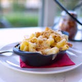 Macaroni & cheese with bacon bits, topped with toasted panko bread crumbs.