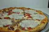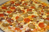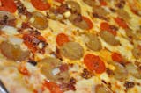 Tomato sauce and mozzarella cheese topped with pepperoni, bacon, sausage, and onion.