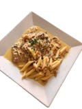 Penne with ground beef and marinara sauce and parmesan cheese.