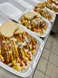Meat hot sauce topped with burger, homefries, & mozzarella. Finished with ketchup, mustard, onions, & mac salad.