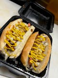 Hot dog topped with ketchup, mustard, onion, meat hot and mac salad.