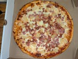 Red sauce, mozzarella, ham, bacon, pineapple.