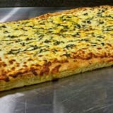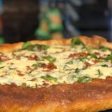 Double Layer of Fresh Dough, Extra Virgin Olive Oil, Fresh Spinach, Garlic, Bacon, Mozzarella Cheese, Pecorino Romano Cheese and Spices.