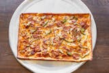 Thin pan-cooked crust with sausage and peppers in a rich tomato sauce.