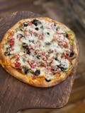 Lettuce, tomatoes, onions, cucumbers & olives over a light tomato sauce crust.