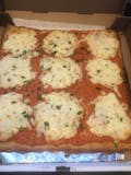 Thin crust square pizza with fresh plum tomato sauce, mozzarella cheese & basil.