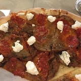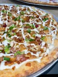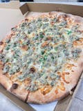 A sauceless pie topped with ricotta, mozzarella, and parmesan cheese.