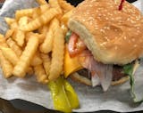 Served with lettuce, tomatoes, onions, mayo and ketchup.