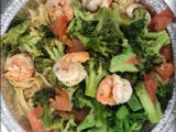 Shrimp and penne pasta sauteed in roasted garlic sauce with chopped tomatoes, red onions and fresh broccoli.