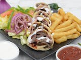 Chicken shawarma wrap cut into pieces. Served with fries, salad and white garlic sauce dip.