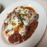Topped with lasagna noodles, mozzarella cheese, tomato sauce and ground beef.