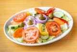Fresh lettuce, tomatoes, green peppers, red onions, cucumbers, and black olives.