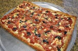 Plum tomatoes focaccia topped with fresh mozzarella, tomatoes, roasted peppers and breaded eggplant.