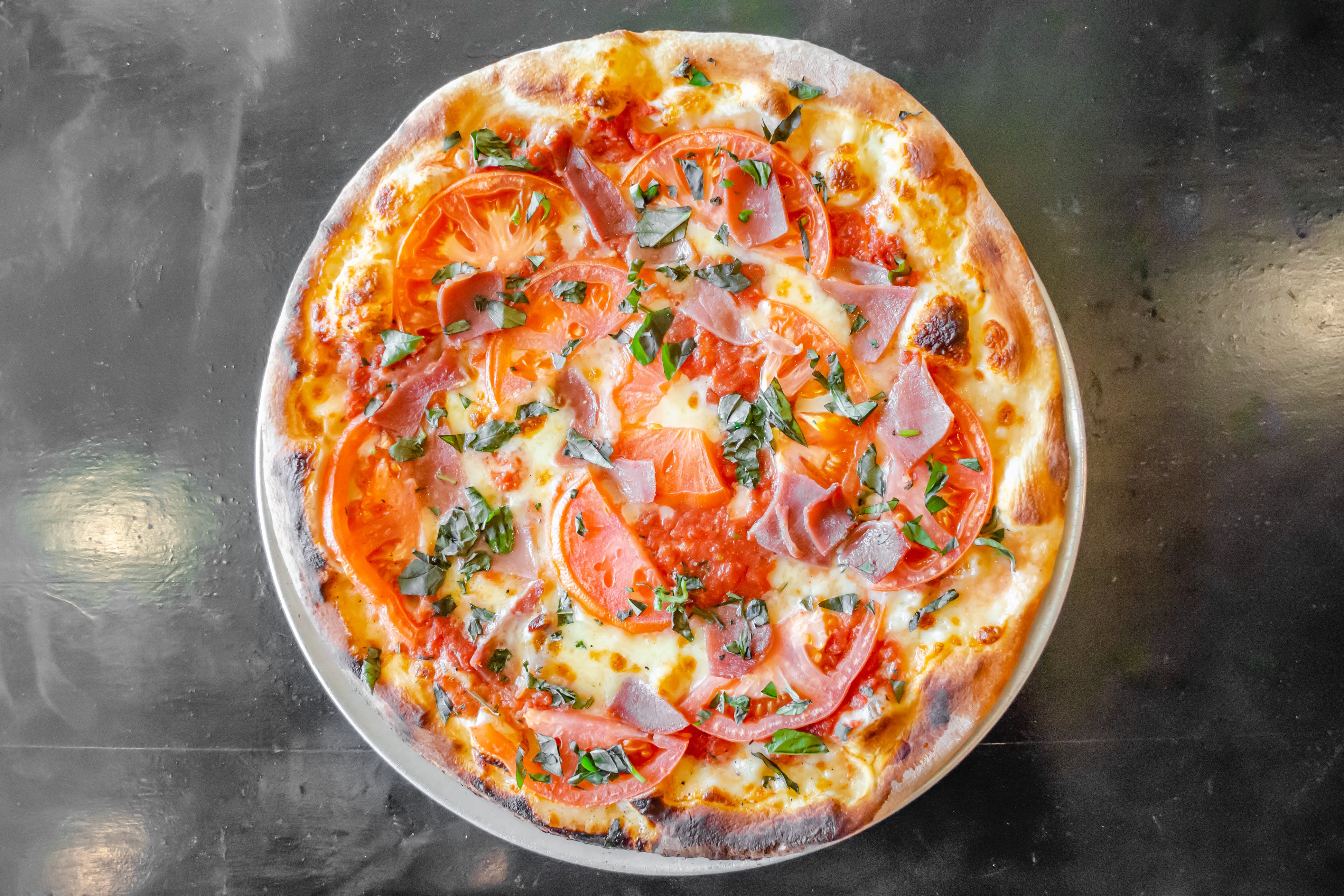 Basil, sliced tomatoes, prosciutto.