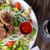 Romaine & spinach base, meatballs, parm reggiano, artichokes, chickpeas, tomatoes, white onions. Served with our Mama's house dressing and red sauce