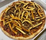 Indulge in a gourmet experience like no other with ziggy's steakhouse pizza! Savor the delightful combination of provolone cheese, fresh mushrooms, juicy rib-eye steak, a-1 steak sauce, and crispy hand-cut fries all on a delicious pizza crust. Treat your taste buds to a culinary delight and elevate your pizza game with ziggy's steakhouse pizza today!