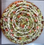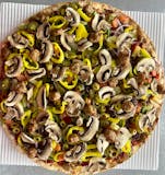 Pizza sauce mixed with fresh garlic oil, gyro meat, red onions, tomatoes, banana peppers, cheddar, provolone, feta, and parmesan.
