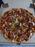 Real cheese, pepperoni, bacon, onions, sausage, jalapeno peppers, banana peppers & crushed red peppers.