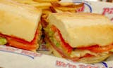 Ham, capicola, pepperoni, salami, banana peppers, onions, mozzarella, lettuce, tomato, red wine vinaigrette.