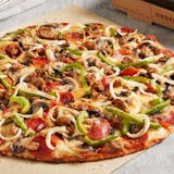 Heritage pepperoni, fresh mushrooms, family recipe sausage, smoked Provolone, Romano.