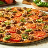 Heritage pepperoni, family recipe sausage, shaved ham, ground beef, hardwood smoked bacon, smoked Provolone, Romano.