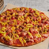 Heritage pepperoni, family recipe sausage, shaved ham, banana peppers, smoked Provolone, Romano.