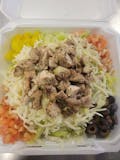 Lettuce, tomatoes, green peppers, onions, black olives, mozzarella cheese, and vinaigrette.