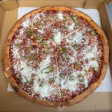 Green peppers, onions, mushrooms, black olives, sausage, and pepperoni.