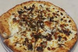 Garlic oil sauce topped with sausage and roasted red peppers. Covered with Mozzarella cheese