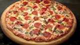 Pizza sauce, premium mozzarella, pepperoni, ham, hamburger, Italian sausage, bacon, mushrooms, onions, green peppers & black olives. 290-430 cal / slice