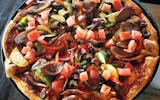 Canadian bacon, Genoa salami, spicy Italian link sausage, pepperoni, ground beef, crumbled Italian sausage, mushrooms, red onions, green & red bell peppers, zucchini, yellow squash, black olives & chopped tomatoes.