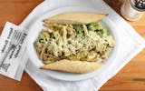 Penne noodles tossed in our light basil pesto cream sauce with grilled chicken breast, fresh broccoli & fresh-shaved parmesan cheese.