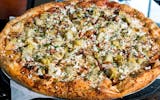 Roasted Roma tomatoes, feta cheese & basil on our olive oil & garlic base.