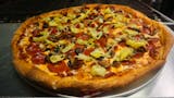 Canadian bacon, salami, pepperoni, onions, mushrooms, black olives, Italian sausage, pineapple, green and red bell peppers, tomatoes, and pepperoncini.
