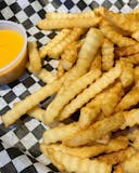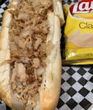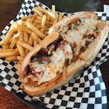 Buffalo chicken steak, mozzarella cheese and French fries.