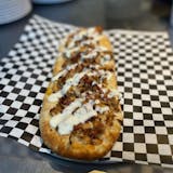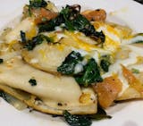 Sauteéd pierogies and onions, mozzarella cheese, topped with blended cheese.