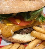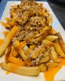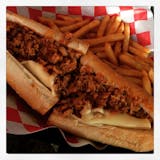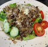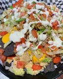 Seasoned ground beef, American cheese, mozzarella cheese, cheddar cheese, topped with lettuce, tomato and tortilla chips.