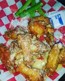 Hot, mild or BBQ chicken, cheese, topped with blue cheese or ranch.
