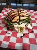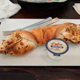 Homemade Garlic Knot, Marinated grilled chicken, Fresh tomatoes, Fresh mozzarella topped with Balsamic glaze